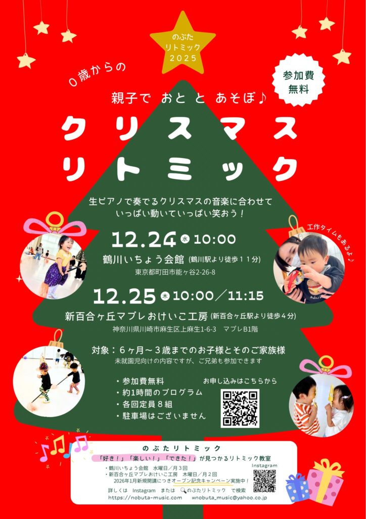2026年1月から新百合ヶ丘で新クラスを開講することになりました!オープンを記念して、今回は参加費無料のクリスマスリトミックを開催したいと思います!