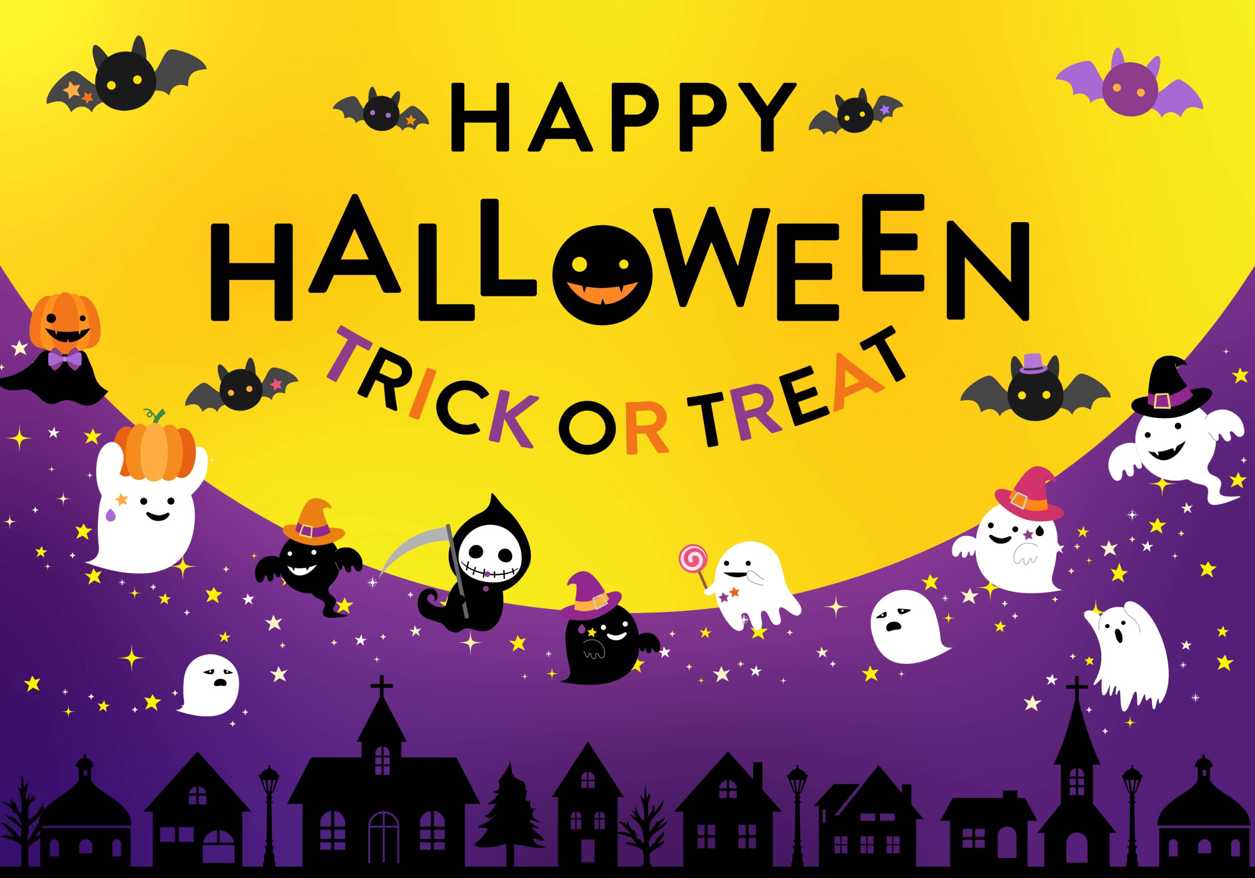 「トリック オア トリート」とは「お菓子をくれないといたずらしちゃうぞ!」という意味。トリックは「いたずら」、トリートは「招待する、もてなす、ごちそうする」といった意味があります。